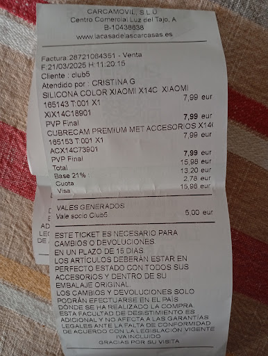 Read moreMe atendió una chica llamada Lucía, lo primero me atendió desganadamente, me sacó la caja de los film que había para mí móvil y ahí me dejó “sirviendome yo”, segundo nada más que hacía decirme que porque no llevaba protector de cámara y que porque no quería ponérmelo, tercero cuando fui a pagarla no me dio el ticket yo se lo pedí y me dijo que no entendía el porqué tenía que darme el ticket, se negaba a dármelo, que no podia dármelo porque era una cosa de 3€… (sea el importe que sea es obligatorio dar el ticket) si yo quiero hacer una devolución, sin ese ticket no podría, finalmente la dije que cuando alguien paga algo lo suyo es recibir su ticket de compra , seguía en su línea y me lo dio como si la pidiera algo súper complicado. me cobró sin darme las vueltas, me redondeó el precio porque la dio la gana, que son céntimos, que no es importante, pero en todas las tiendas se dan las vueltas, es decisión del cliente si quiere que la persona se quede esas vueltas o no, no es decisión de la empleada, así que tengo muy claro que no...