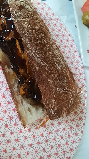 Descripción: El de pato confitado, salsa de miel y soja, cebolla, etcétera, es sencillamente espectacular. Contad con que la carne del pato unas veces es más tierna y otras veces menos tierna. El de albóndigas de ternera, salteadas en mantequilla de hierbas y boletus, espárragos trigueros, brie y patatas caseras a láminas. Muy muy bueno. El de sepia a la plancha, alcachofas fritas, mahonesa de hierbas y majada de almendra, bacon y perejil. El de torreznos de Soria, lechuga y guacamole: es un bocadillo fresco, que es digno de mención y muy ideal para días de calor.