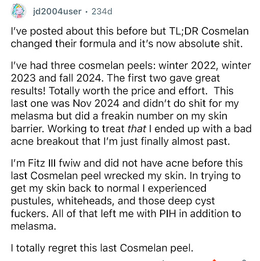 Read moreChanging the Cosmelan peel formula and not making it official is illegal. People expect one thing, pay lots of money to receive a different product. Shame on you!