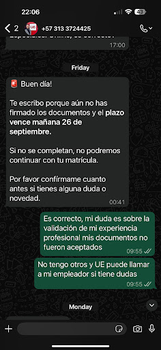 When I contacted the program coordinator, I was initially told to “focus on getting well” — a moment of relief that turned into disillusionment when I was suddenly contacted again, while still awaiting surgery, and told to return to Spain within a week to take my exams. Despite clearly explaining my medical situation and later providing official surgical documentation, I never received a single reply.