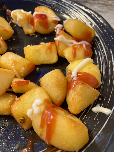 Al entrar en el bar, nada parecía especialmente extraño, excepto por los innumerables platos, tazas de café y copas sin recoger que se apilaban en la barra. La decoración, aunque no era especialmente acogedora, era lo suficientemente agradable como para pasar un rato tomando algo. Una de las camareras se escondía detrás del tirador de cerveza, como si no quisiera que la vieran. La otra camarera, con una expresión distraída y poco interesada, nos miró tímidamente. Parecían ocupadas, como si atender al cliente no fuera su principal prioridad. Su mirada se detuvo en mi compañera. "¿Qué queréis?", preguntó. Pedimos una caña y, tras echar un vistazo a las infusiones, decidimos probar una de té blanco con vainilla y unas patatas bravas.