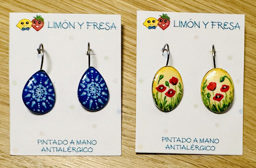 Yo soy una clienta habitual y entre todas las joyas hechas y pintadas a mano, los pendientes grandes son mi debilidad: tengo unos pendientes con el cuadro "Composición en rojo, amarillo y azul" de Mondrian, otros de la silueta de Mary Poppins y El Deshollinador en turquesa que llaman la atención siempre que me los pongo.... mi última adquisición son unos de "Mortadelo y Filemón" que son fantásticos y perfectos.