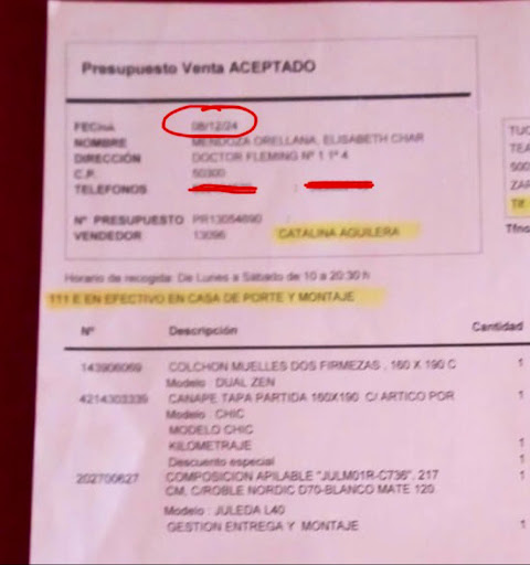 8 de diciembre: mi madre quiere hacerme un regalo (canapé + colchón) por navidad. La señora CATALINA nos ofrece con la mejor atención (claro, normal porque van a comisión y su trabajo es vender, no? Más aún si esa venta es arriba de 2.000€). Finalmente, mi madre, Elizabeth, decide comprar: dos canapés+ dos colchones+ mueble de salón. Catalina nos informa que el pedido lo tendríamos para la segunda quincena de enero 2025. Mediado de diciembre: llama Catalina para informar que la gama de canapés que nos ofreció no lo tienen, así que elegimos una gama superior. Mi madre fue personalmente a la tienda para abonar la diferencia de precio por esa gama (por miedo a las estafas telefónicas), y unos compañeros tuvieron el fallo de gestión porque le aseguraron más de una vez que NO tenía que pagar nada…