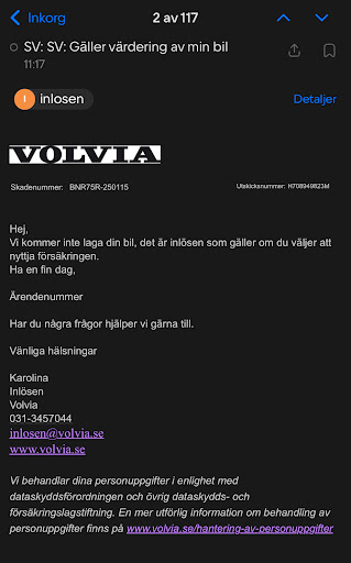 Read moreVid nöd lämnar kund åt helvete👎😔 Otroligt långt tid handläggningstid👎👎Ett halvår att få svar, sen trots man betalar hel dyrtförsäkring så vid nöd de delar skadan i 2-3 delar och betalar en liten bit av skadan och kastar ut kund åt ovisshet med massa frågor, otroligt svårt nå handläggare, vid överklan ej svar trots tiden ticker långt... Frustration och stress är på topp men vad är det för försäkring att nonchalera kund... Varför man ska vara kund hos Volvia ens med sånt hemskt bemötande 👎 Varför man ska välja Volvia överhuvudtaget när som kund blir utesluten och får inte hela vägen hjälp trots jätte dyra pengar varje månad dras till Volvia👎 Hur ska man lita som kund på Volvia efter en sånt hemsk upplevelse👎👎 Nej, Volvia är opålitligt, ej bra, hörde helt annat om Volvia innan men nu själv upplevde helt...