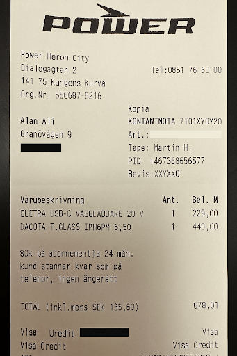 Gick in pÄ Power Heron City för att köpa en dator. Första butikssÀljaren jag pratade med kunde inte hitta om den fanns i lager och skickade mig till en andra butikssÀljare, som gick och kollade i lagret för att komma tillbaka utan dator. Den fanns tydligen i systemet, men inte fysiskt. Andra sÀljaren skulle kolla med butikschefen för sÀkerhets skull. Gick ivÀg och kom tillbaka med en dator. Kartongen var öppnad, men jag fick förklarat att det var för att tidigare kund velat se datorn. Den var inte begagnad. Jag slÄr till, kommer hem, pluggar in datorn och möts av en inloggningsskÀrm. Datorn Àr begagnad och lösenordsskyddad. Mejlar kundtjÀnst samma dag. NÀr jag inte fÄtt nÄgon respons efter klockan tre följande dag, ringer jag kundtjÀnst. NÀr jag uppger modell pÄ datorn sÀger personen pÄ kundtjÀnst "Ja, du har mejlat ocksÄ". Har inte uppgett fullt namn, ordernummer eller liknande innan. Dom kÀnner till mitt Àrende, men har inte hört av sig. KundtjÀnst erbjuder sig att kontakta butiken som ska ringa upp mig. Jag tackar ja och fÄr en bekrÀftelse pÄ mejl som sÀger att butiken "kommer att hantera ditt Àrende sÄ fort som möjligt, och kommer att kontakta dig snarast". TvÄ timmar senare mejlar jag kundtjÀnst för att berÀtta att butiken inte kontaktat mig. Nu har det gÄtt ytterligare fem timmar. I skrivande stund Àr butiken stÀngd sedan en dryg halvtimme tillbaka, och har Ànnu inte kontaktat mig. I nuvarande lÀge kan jag inte rekommendera Power till nÄgon.
