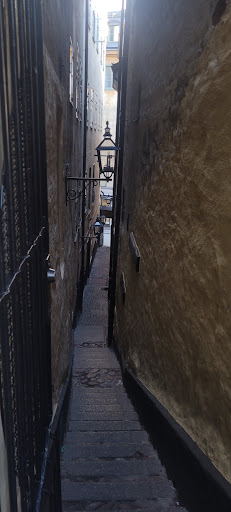 Mårten Trotzigs gränd is an alley in Gamla stan, the old town of Stockholm, Sweden. Leading from Västerlånggatan and Järntorget up to Prästgatan and Tyska Stallplan, the width of its 37 steps tapers down to a mere 90 centimetres, making the alley the narrowest street in Stockholm.
