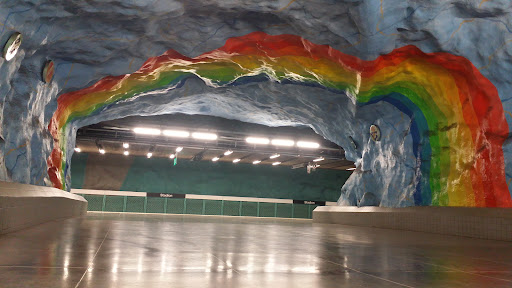 If anything the designers Enno Hallek and Åke Pallarp aimed to extinguish the negative misconceptions about the stations. They were coined as being something along the lines of dark and woeful places in the seventies. By painting a blue sky and vivid rainbow, onlookers would be reminded that the roof of the world is not far away.