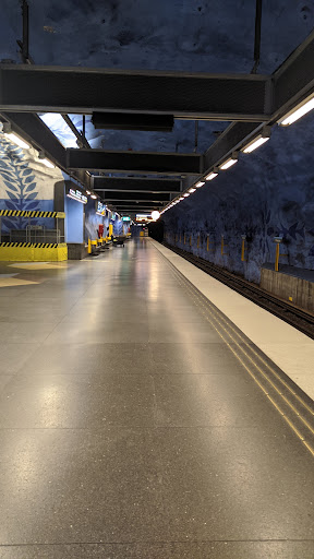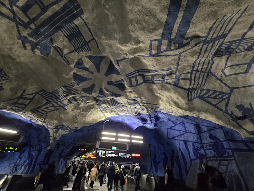Read moreâď¸âď¸âď¸âď¸âď¸ T-Centralen is definitely one of the most impressive and memorable metro stations in Stockholm. Itâs not just a major transfer point where all three metro lines meet â itâs also a beautiful piece of underground art. The blue and white cave-like walls covered with silhouettes, industrial shapes, and floral patterns create a calm, unique, and slightly surreal atmosphere.