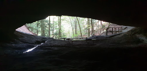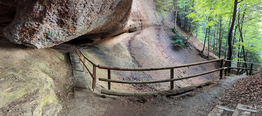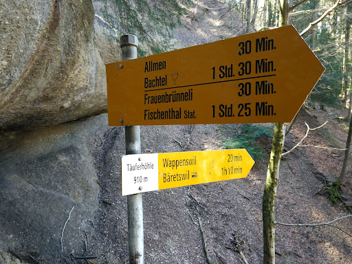 Read moreEine der vielen solchen spannenden Höhlen im Zürcher Oberland. Diese ist sehr düster, weil sie weit in den Fels hineinragt und auch wegen der vielen Feuer, die darin seit dem Mittelalter angezündet wurden. Schliesslich lebten hier viele Jahrzehnte (bzw. Jahrhunderte) lang die damals verfolgten Täufer (s. fotografierte Tafeln) und heute werden hierhin Ausflüge mit Grillmöglichkeit gemacht. Es hat heute allerdings eine sehr gute Feuerstelle gleich vor der Höhle. Ein Besuch der Höhle lohnt sich auf jeden Fall. Der Blick aus der dunklen Höhle heraus in das Grün des Waldes ist faszinierend. Im Frühling oder nach Regenfällen kommt man zusätzlich in den Genuss des typischen, zu solchen Höhlen gehörenden Wasserfalls. Ab der Höhle kann man auf Holzstufen bis zum Allmen (1076 m) hinauf und weiter über die Höhenzüge der Region wandern (z. B. auf den Aussichtsberg Bachtel) - mit tollen Weitsichten, auch sehr...