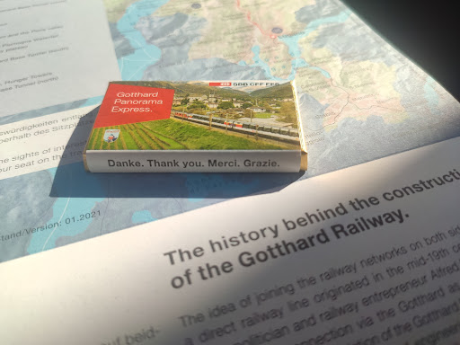 Arriving in Flüelen its a mere 100 m walk to the the train station, where within 15 min the train arrives. Beware that advance reservations is required for the panoramic train that runs only once daily in each direction. The staff was very welcoming and accommodating, I wasn't aware there would be a multi lingual guide on board and the human touch instead of canned recording made the whole experience more special. There's also an overview map and guidebook. The newer air conditioned wagons have panoramic windows, there's an older one where one can open windows to take photos, too. The restaurant serves light meals, including vegan options, though they took a while to arrive. A little Swiss chocolate at the end topped it off. :)