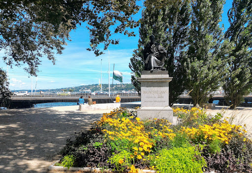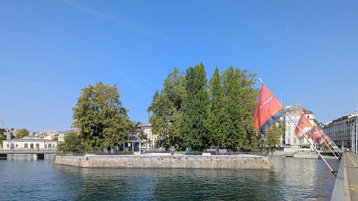 Rousseau Island or in French L'Ile Rousseau, is a heart-shaped gravel ground island with some trees, sitting between the Pont des Bergues and the Mont Blanc bridges in the river Rhone. The island is connected to the Pont des Bergues by a narrow short bridge-path. The place is mostly popular during summer as it is a pleasant spot to grab a sandwich and a drink from a small cafe - Pavillion de L' Ile Rousseau. The cafe also offers wine, tea, coffee, baguettes, some salads, paninis, cakes and ice cream. On a hot day it can be a welcome resting stop to bite into a cooling ice-cream and chill out under an old tree on a bench, observing the life on either side of the river. The banks of the island are frequented by swans and ducks, but the island itself is fenced for security reasons. There is a drinking water spring point on the island, a very Genevan feature. Please note that dogs are prohibited...