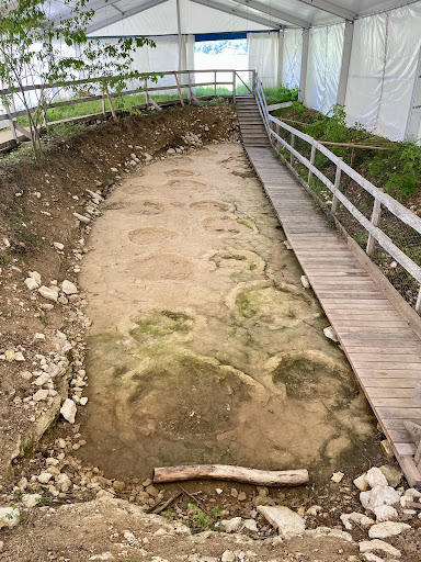 Gut gemachter Lehrpfad, mehrheitlich entlang eines Waldsträsschens. Die Fussabdrücke selbst befinden sich ganz am Ende des 1.7km langen Pfades (ein Weg, hin und zurück entsprechend knapp 3.5km), auf GoogleMaps markiert als Sehenswürdigkeit („Empreintes...