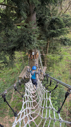 They offer a variety of creative courses and levels and all are accessible to anyone 135cm tall with 155 cm reach which meant my 9 yr old was FINALLY able to go on cool courses rather than being stuck in the kiddie zone while big brother had all the fun. He did get stuck at the end of a few zip lines that didn't have stepping logs at the end but was easy to help as parent zipped across right after to unclip him.