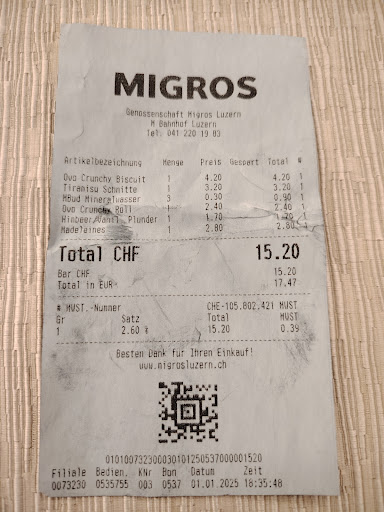 I had a very disappointing experience at the Migros supermarket on 1 January 2025 around 6:30 PM. I went to Migros to buy groceries, and the total bill was 15.20 CHF. I handed the cashier with a 20 CHF note (the red note), but since I'm a tourist and am not very familiar with the currency, I pulled out some coins and asked if she could help to pick out the 0.20 CHF. Instead, I saw her took a 5 CHF coin together with another coin which I presumed to be a 0.20 CHF coin.