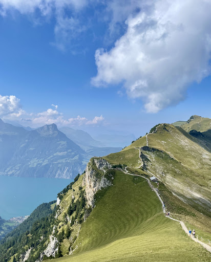 Con la funicolare Schwyz-Stoos (la piĂš ripida del mondo) si sale a Stoos. Da qui altra seggiovia in vetta (Klingenstock) poi un trekking sali e scendi sul crinale di un paio dâore ti porta sullâaltra vetta (Fronalpstock) dove câè anche un ristorante e la seggiovia per rientrare. Costa 52 franchi la salita e nel weekend câè davvero tantissima gente, sul crinale capita di...