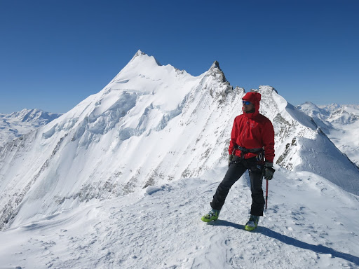 Nun noch die letzten Meter zum Gipfel hinauf, zuletzt vorsichtig eine Spalte überquerend. Dann steht man auf dem Bishorn (4153 m) und genießt erneut den faszinierenden Blick auf diesen fantastischen Grat, sowie die Rundsicht in die Runde.