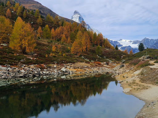 This lake doesn't get Matterhorn reflections but of course can have reflections of the surrounding mountains. Note if you stand just right, back away from the lake, you can get a peakaboo view of the Matterhorn...