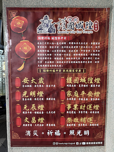 " Keelung Huguo Chenghuang Temple "is a century-old temple located on Zhongyi Road (North Coast Highway) in Ren'ai District, Keelung City. It is one of the four major temples in Keelung, along with Keelung Qing'an Temple, Keelung Dianji Temple, and Keelung Shaochuantou Juexiu Temple. It is the center of Keelung City God worship, especially the three important festivals every year: the "Birthday of Keelung Huguo Chenghuang Ye" on the third day of the third lunar month, the "Birthday of Keelung Huguo Chenghuang Ye" on the fourteenth day of the eighth lunar month, and the "Birthday of Keelung Huguo Chenghuang Ye" on the fourteenth day of the eighth lunar month. The Keelung City God Cultural Festival - Night Procession and the Keelung City God Cultural Festival - Daytime Procession on the 16th day of the eighth lunar month are activities that stabilize the lives of the people and pray for Keelung through processions in the city of Keelung. The old custom of giving out salty biscuits during the processions has also been preserved.