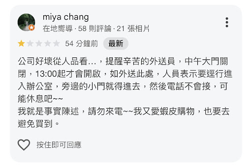 結果外送人員提早送達,當時正是我們公司午休,大門未開且同事不便接聽電話。該名外送人員於我們公司Google留下一則一星 Google 負評,對公司商譽造成不良影響。