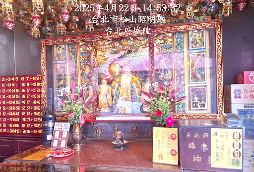 以下內容取自維基百科資訊: 台北府城隍廟,舊稱松山昭明廟,是位於臺灣臺北市松山區的城隍廟,主神為臺北府城隍,與臺灣省城隍廟都是源自臺北府縣城隍廟。
