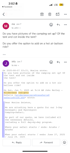 The owner, JOHN MALLEY, refuses to issue a refund, and it's clear this is not a legitimate business. They use stolen photos, from other companies, to lure customers into paying for services they never deliver. Save your money and your dream vacation – and book elsewhere. This was a once in a lifetime experience that has been completely ruined by WILDERNESS INSIGHTS SAFARIS and John MALLEY.