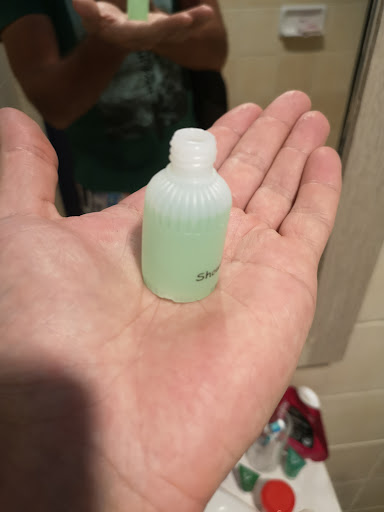 В санузле обнаружили 2 маленькие б/у бутылочки без пробок, в которые что-то доливают, возможно это гель для душа и шампунь. Годится для стирки носков. Выбрасывать эти бутылочки нельзя - штраф.