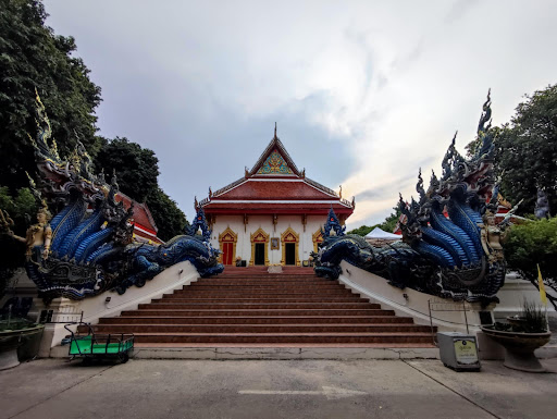 Il tempio ÃĻ una testimonianza dell'armoniosa coesistenza di buddismo e induismo nella città . Immerso in un angolo sereno del centro storico, questo complesso non ÃĻ solo uno dei piÃđ importanti della città , ma anche un'accattivante fusione di tradizioni religiose. Questo grande tempio buddista Theravada, si erge maestoso dal centro di un tranquillo stagno, proiettando un tranquillo riflesso nelle sue acque tranquille. à noto per il suo straordinario santuario, che aggiunge uno strato intrigante al suo arazzo spirituale. Man mano che ci si avvicina al tempio, si svela un tesoro del patrimonio. Qui si incontrno quattro antiche statue indÃđ in stile Khmer che sono state portate alla luce sul terreno. Al centro di questa collezione c'ÃĻ un'immagine di Phra Narai, l'incarnazione thailandese del venerato dio Vishnu. Ai lati di Phra Narai ci sono statue piÃđ piccole di Phra Phrom (Brahma) e Phra Isuan (Shiva), con un'immagine di Ganesha in piedi a sinistra. Queste statue, anche se di dimensioni modeste, recano dettagli sbiaditi e resti di foglie d'oro, offrendo uno sguardo sulle ricche connessioni storiche del paese con l'induismo. All'interno della sala del santuario che ospita queste antiche immagini, si trova un accattivante dipinto in stile indiano che ritrae varie divinità , con Vishnu al centro, adornato di un blu sereno. In un angolo della stanza, un ritratto realistico in stile indiano del Buddha abbellisce lo spazio. L'eclettismo del tempio si estende oltre l'induismo, con una statua in stile cinese di Kuan Yin, la dea della compassione, e un'imponente statuaria situata in modo prominente all'esterno. L'atmosfera ÃĻ ulteriormente esaltata dalla miscela aromatica di incenso e fiori profumati, creando un'esperienza spirituale davvero coinvolgente. Vanta una grande sala per le ordinazioni che sembra galleggiare sul tranquillo stagno, accessibile tramite un'affascinante passerella, dove spesso trovano gioia nel dare da mangiare ai pesci che abitano lo stagno e, in alcune occasioni fortunate, possono anche intravedere le enormi lucertole varani che chiamano casa questa dimora acquatica. Questo ambiente pittoresco invita alla contemplazione e alla serenità , permettendoti di connetterti con il mondo naturale mentre ti immergi nell'aura...