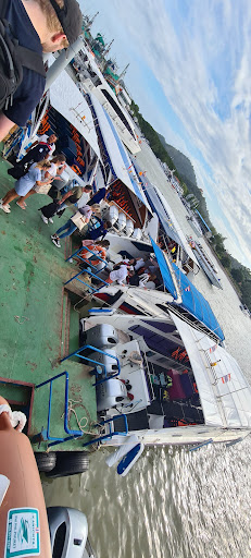 We booked the night before and I got an ominous "pickup confirmed" reply back from the company with a 15 minute window. Rocked down to the lobby expecting to have been tourist trapped, but lo and behold 8 minutes past their designated timing this mad mini van with reflective interior decor rocked up to take us to what I can only describe as organised chaos. The Rassada pier is in itself a hectic experience, and the staff from each company exchange patrons like a well rehearsed trade - walking up and down the terminals with a duckling-esque line of foreigners. We got our little sticker from Andaman, and a confirmatory nod our last minute tickets were legit. I was delighted to see a bowl of nondescript pills on the counter which I could only imagine/hope was travel calm (after having seen the winds pick up on our balcony that morning this was some kind of saving grace). We got ushered to the boat 20 mins later, given life vests and packed in against strangers before hitting Sea State 5 at like 40 knots. It was amazing fun to rocket through the Andaman Sea, some people definitely looked like they weren't exactly enjoying themselves, but the staff were quick to respond with plastic bags for anyone who didn't take from the pill bowl.