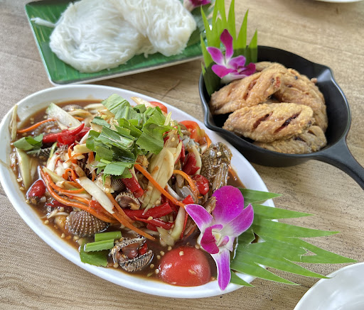 ร้านมีที่นั่งแยกเป็นซุ้มๆ ริมน้ำ และโซนสวน วิวสวนยาง ดูร่มรื่น ลมเย็นดี มีเรือให้พายเล่นด้วย โซนริมน้ำไม่ใหญ่มาก เมนูอาหารหลากหลาย หน้าตาอาหารน่าทาน แต่งจานดูดี สั่งเมนู -ปีกไก่ทอดน้ำปลา เสิร์ฟใส่กระทะเล็ก น่ารัก ปีกไก่ทอดมากรอบดี ราดน้ำซอสรสหวานมาด้วย ทานกับส้มตำเข้ากัน -ตำหอยแครงปูม้า รสจัดจ้าน ใส่ปลาร้านัวดี มะละกอเป็นแบบสับ สดกรอบ ปูม้าตัวใหญ่ดองน้ำปลาสดมากมีมันด้วย อร่อย หอยแครงลวกแบบยังมีเลือด สดดี ทานเข้ากับน้ำส้มตำค่ะ -ขนมจีน จานโตเลย...
