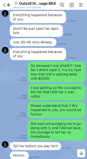 After communicating pleasantly on WhatsApp, I selected a therapist for 90 minutes. She arrived in about 45 minutes (okay) and did not look like her photo. However, she was wearing a lot of clothing so I couldn’t tell for sure. The service I selected was 2700 thb. She came to my room and Went into the bathroom. She called me in and told me to pay, which I was ready to do. I provided her 3000 (A little extra for good faith). It was clear she was not the same person, or possibly the same person 15 years older with multiple tattoos and scars not in photo, plastic surgeries to the point of looking like a different person.I went back into my room and looked at the photos I had seen earlier and was convinced that it was not her. However, I decided to proceed. We showered and then I Calmly shared my concerns that she wasn’t the therapist in the photos. She insisted she was, and hurriedly told me to lie down for the massage.she began a standard massage. I became increasingly uncomfortable, and after about 10 minutes of the massage (about 20 minutes after her arrival) I told her that I wished to stop, and that I would offer her ฿1000 for her time. She told me it was too late and she went into the bathroom, Came out, gave me 1000 baht, And walked out of my room, ignoring further polite and respectful protests of mine. She left having been paid 2000 thb for a 10 to 20 minute standard oil massage outcall under deceptive marketing. The massage operator reached out to me over text and asked me what happened. I respectfully explained how I felt that I was deceived, but I was willing to still give her some money for her time. The operator told me that it was my fault for agreeing to start the massage. They refused to instruct the therapist to come back and give me any more of my money back. They ended the conversation before any resolution occurred, and blamed me several times for my misfortune because I agreed to start the massage.