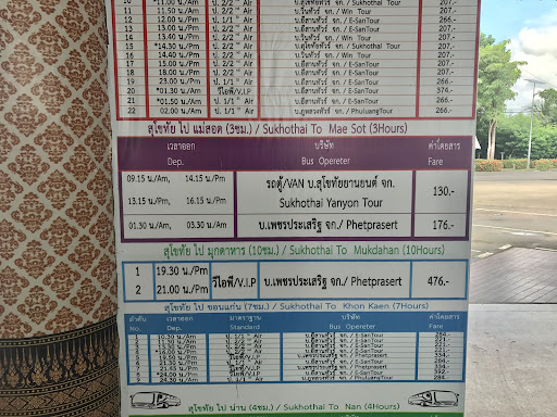 Read moreKleine, übersichtliche und gepflegte Busstation, mit zum Teil unfreundlichen Angestellten in den Ticket -Schaltern, weil sie sich beim Spielen auf dem Smartphone gestört fühlten. Die VIP Busse in Richtung Chiang Mai, Khon Kaen und Bangkok starten meist am frühen Morgen oder späten Nachmittag. Die Fahrt nach Bangkok kostet im VIP Bus ca. 380 Thai - Baht. Die Fahrt von der Bus-Station zur City kostet mit dem Tuk Tuk ca. 100 Thai - Baht. Der Sukhothai Historical Park ist ca.15...