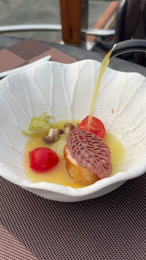 👉Savory chicken in golden puff with curry powder and truffle – a delightful, crispy start. 👉Crispy rice pancake with crabmeat – light yet flavorful. 👉Coconut crème brûlée with sturgeon caviar – a surprising balance of sweetness and umami.
