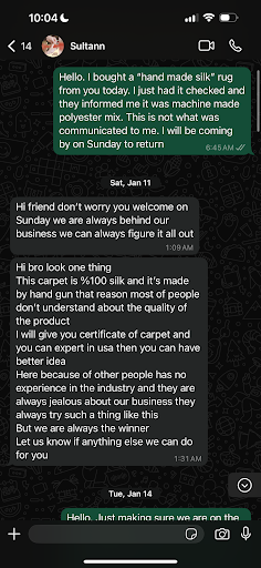 Read moreREAD ALL THE REVIEWS BELOW! These people are frauds. They currently have $750 of my money after returning a carpet that they lied about being a hand woven, turkish rug. After returning IN PERSON, they said they would credit me back. They never did, after I sent them all the correct information to refund me multiple times. I have uploaded the conversation, and the run around. They also submitted FALSE documents to capital one from purchase made in 2024 (I made mine in January 2025). Not good practice. They will delay you until you can't move forward with a complete charge back. I hope this review costs them more than the $750 they are attempting to steal from me. All it takes is one person reading this before they buy, and they will have lost more than it would just refunding me in the first place. I will take this review down if they ever decide to do the...