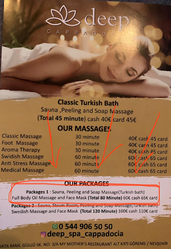 Read moreI feel compelled to share my disappointing experience at Deep Spa Cappadocia to warn others. Firstly, I advise not to trust what the man at the reception says, as it turned out to be a complete scam. The promises of a great package were nothing but empty words.