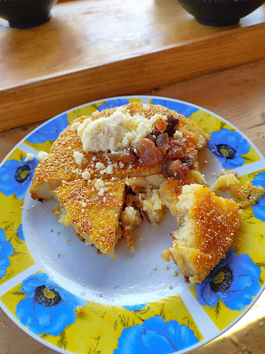 Окремо хочу вказати за кафе на території. Все колоритно, красиво. Начитавшись відгуків про страви, їхали з впевненістю, що наїмося від пуза, і нажаль не взяли з собою ніякого перекусу. Проте дуже розчарувалися. Можливо різні зміни поварів чи що, але... Замовили борщ - а це насічені великі шматки буряку, моркви і ціла величезна картоплина, і шматок жиру на хрящі/кістці, із частинками м'яса пересохшого (наче окремо відварене і обвітряне). Здивувало, що до борщу не подається ні пампушечка ні шматочок хліба, і працівники навіть не вказали цього. Також начитавшись відгуків взяли картопляний корж з бринзою і шкварками - це сформований корж із картопляного пюре обваляного в кукурудзяній муці, присмажений і зверху кинули підсмаженого сала і столова ложка бринзи. Малесенька страва 180 грн. Ніяке. Важливе уточнення - посуд. Все подається не в одноразовому посуді, так це дуже добре. Але посуд був надщербнутий. Це прям неприємно. Бо колотиш той борщ і думаєш, чи ця тарілка надщербнута давним давно, чи відколовся шматок коли тобі насипали той борщ ? І зараз хрусьне щось на зубах!? Столові прибори теж не одноразові. Потік людей великий.