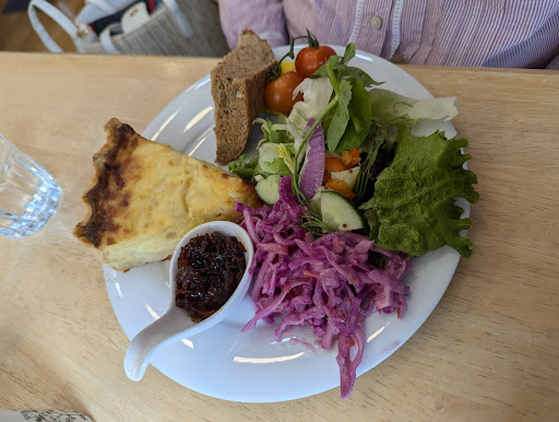 Read moreMy wife and I made a pre planned stop here for some lunch and a break in our journey from South Wales to North Wales. Well worth it, not a big cafe and wasn't overly busy when we stopped fortunately. Very clean and maintained cafe, excellent service from the staff who were very polite and helpful. I ordered a ham & tomato sandwich, which came accompanied with a small salad and some crisps. My wife ordered a cheese quiche, accompanied with a salad (see pictures). My wife ordered a regular hot chocolate, had 2 in fact and I ordered a glass of their local red wine, which was very nice not a full body wine. Actually bought a bottle to take away with us for £20. They also do a nice looking afternoon tea, which has to be ordered 48 hrs in advance. Would certainly recommend the food, service...