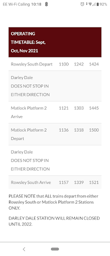 Beware of the website! Clearly states 'back in steam' running from September. I checked information before traveling, including the calendar. Nothing to suggest it wasn't running on the day we selected. Decided to travel from Matlock. Car park directly next to the station. My husband run in to ask about train tickets but there wasn't anyone around to ask. However, there were many people on the platform so we paid for all day parking and headed for the platform. We couldn't work out how to get over to platform 2, so asked some other passengers, who we're picking up a train from platform 1. They said the steam train wasn't running anymore. Then another couple joined in saying they were looking for the steam train too, as the website said it was running. We both double checked the website and didn't see anything to suggest it wasn't running. We found our way over to the entrance to platform 2 (by Sainsbury's) and the gate was locked! There was a poorly printed sign on the gate saying the train only run on select days. Nowhere was this shown on the website. I then called Peak Rail and the phone rang off. I checked the website later and still couldn't find any information about select days they run. However, today after being promoted by Google to review Peak Rail I thought I'd look again and low and behold, they've added information of when they run (screen shots attached). If only this was on there a few days ago. No information at the station at all. Poor. A further note to those who purchase a transferable all day parking ticket, it can only be used at Matlock station and the agricultural centre car park in Bakewell....