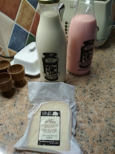 Great place for fresh cow milk, flavoured milk, cheese (also butter, fudge, brownie & lemon curd were being sold) 24/7 - that's right, fresh milk available anytime of the day - and a nice selection of flavours too: vanilla, strawberry, banana and chocolate as classic/standard flavours all year round and we had banoffee and salted caramel as limited edition flavours to choose from on top. £1.80 a litter of flavoured milk / 1.20 plain milk and £2 for a reusable...