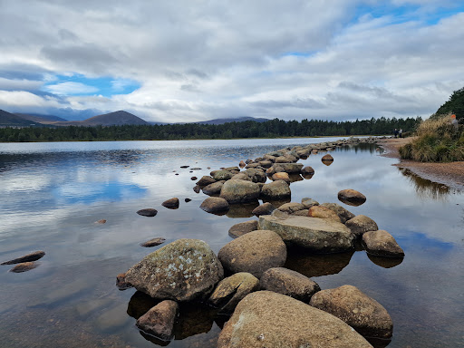 Foot/cycle track too close to the main road and on other side of road not by lake. As path shared with cyclists, pedestrians and dogs had to dodge them frequently. Not a relaxing,scenic walk with dogs unfortunately unlike loch an Eilein, which was safe and scenic. Won't return...