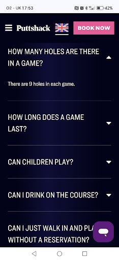 In my most honest opinion, Puttshack is a truly unreal experience. The music fits with the atmosphere and the lighting, making the place more lively. the main golfing area is split up into 4 areas, with their unique courses. You don't even have to go in order! (except for the last one). The tech/systems here are very advanced. An example is because there's a screen for each course, telling you how much shots you get for each hole, and it displays everyone's registered names. You have to pre-book an available timing first. It's worth it. The voice that's on the screen sounds very energetic and lively, sounding very happy to be there. The voice also has humor depending on how many shots you took. i think this is a really cool feature. One of my favorite courses is the wheel. Your ball has to roll past the wheel sensor and if you get a hole in one, you win the random free prize! Talking about free prizes, I came here during a Halloween event and while golfing I found an orange ball. If you found one of these. You could approach a staff member and exchange the ball for a free coupon of food. I chose the doughnut sundae. It was very filling and yummy. I might be crazy for saying this, but me and a group of friends cheated on our 2nd course 🫢🤫and we were on the leaderboard and it was under MY name!🤯 Since it was with friends, I wanted to join in and I had lots of fun doing so while not ruining the fun for others as it's only a daily leaderboard so it would've reset the next day. I was having a laugh the whole entire time.The staff are also nice and there's a built-in bar which has a variety of drinks for adults. If you pre-booked, there should be no wait because atleast 1 or more of the sign in machines are free if you come during the morning (9am-11:30am) I would also heavily recommend this place for parties as it is infinitely fun, with friends and family. I would come here any time, even night. Overall, a very good choice for indoor golf and an 11/10...