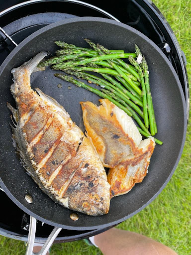 A quick picture herewith of Camp-site pan-fried Pollock & ready-prepped whole Bream cooked simply with a little chilli olive oil & asparagus. Additional garlic butter & garnished with lemon & a little parsley supplied by Jamie.. Just an absolutely superb bit of fish - so simply, quickly & easily cooked - even by me!. Talk about wonderful & unforgettable holiday memories! Thank you again Jamie & Rockfish!