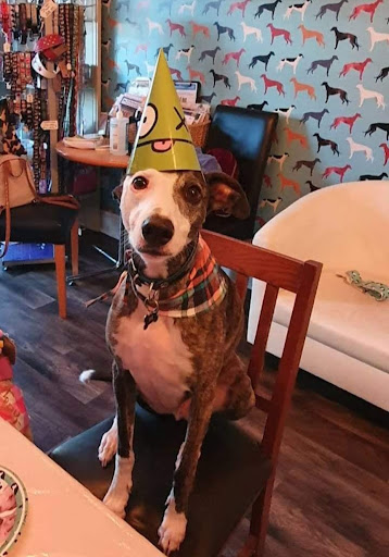 For my 65th. Birthday I was given a voucher for afternoon tea for two plus dog. What a treat that turned out to be!.It was fantastic, my wife Heather and I with little 'Fudgie in tow ,' arrived for our booked afternoon tea. We were greeted very warmly, by a gorgeous Male Lurcherร called 'Spike' The owner Jayne was fantastic, and greeted the three of us so warmly we knew that this was not going to be our first and last visit to the "Blue Whippet!" We were shown to our reserved table, amidst this charmingly "quirky" but above all exquisitely clean and spotless establishment, considering the potential of having had millions ( if the Photo's on the wall of fame , is anything to go by)of 'poochy' visitors and their owners. There was no evidence of 'poochy' odours.The level of hygiene is amazing. We were brought the menu of sandwiches on offer, written upon a bone shaped blackboard. Our order was taken, and our choice of beverage was delivered followed by a charming afternoon tea stand, with an assortment of doggy treats for little 'Fudge' complete with a bowl of water and a comfortable little mat for Fudgie to recline whilst she surveyed what was on offer off the stand which bore her name. Our stand was brought to the table with the Sandwiches chosen plus scones and cakes. Our coffee pot was replenished with delicious ground coffee, enough for two more cups of coffee in exquisite China cups with floral painted design adding to their highly pleasant appearance. The food was gorgeous sandwiches were presented with very generous deep fillings in bread as requested which oozed freshness in appearance, touch and ultimately taste. We were advised by a kind young lady regarding 'Fudges' anxiety on being taken for rides. The same lady, we learned is responsible for the generous stock of collars and leashes made by herself, with an amazing choice of design and sizes. Also on offer were knitted items to keep our 4 legged friends, plus bandanas in three sizes and designs all at very reasonable prices considering the excellent quality of work in evidence, and wouldn't look out of place in Pets at home etc.. We then met a lady with her two dogs, one definitely a Chihuahua possibly both. Fudge wasn't too impressed with these two bundles of joy, and made it vocally obvious, obviously apologies were offered to the lady. We then met " Willow" a gorgeous 'wooly' bundle of sheer joy. Fudge was given her ' Doggie bag'( she doesn't seem to like treats outside her home environment).We also received a 'Hooman' box . Fudgie and I went for a look at the copious amounts of Doggy themed gifts, and the Wall of fame photo wall. All sorts of Doggy themed events coming up were advertised. "The Blue Whippet!" just has to be visited, I defy anyone not to be smitten by its Charming quirkiness, on walking through the door. If I was asked to score, here is my scores.
