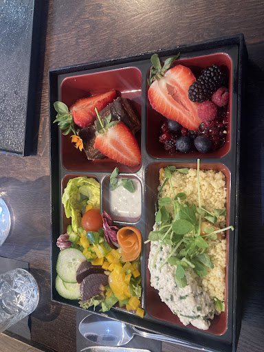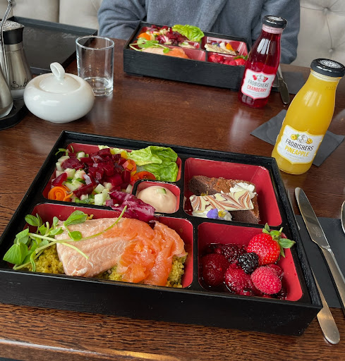 Lunch: The spa day included complementary drinks and lunch (or afternoon tea). My partner and I opted in for the lunch option. We both had salmon, this came with couscous, salad, a brownee, and a berry compote. Lunch is served bento-style. It all comes at once, and fairly quickly. Complementary drinks are offered during lunch (you get hot drinks, or options of juices - cranberry, apple, pineapple, orange). Our table was ready when we arrived, and we were served immediately.