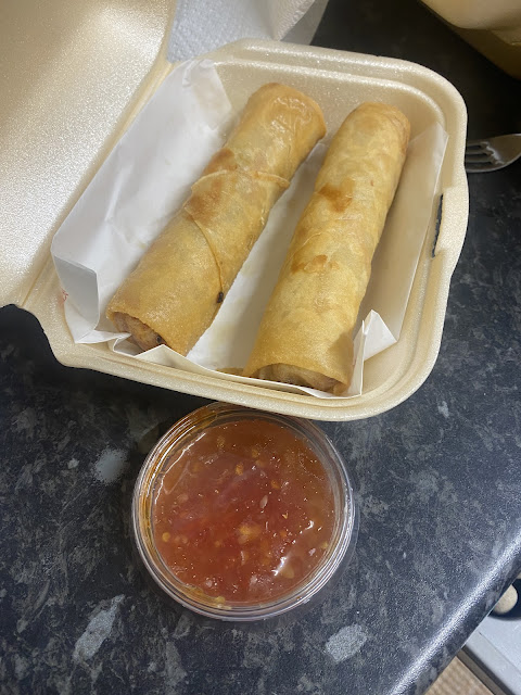 Today for new years day we ordered a delivery of a wet chow mein, duck spring rolls with hosin sauce