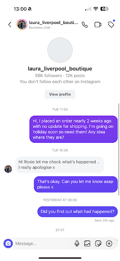I placed an order 31/07 and expected delivery to be around a week. 10 days had passed with no updates shipping information, so I waited a few more days. 2 weeks passed and still nothing. I sent an email but it bounced back as the email address given was wrong. So I found this company on instragram and sent her a message. She told me she would look into what had happened⦠another 2 days passed and I had been left on read! Currently trying to go through my bank to get a refund as she doesnāt...