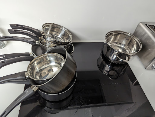 So why the 2 stars? The pans provided for cooking did not work with the induction cook top. In the picture, the pans on the left were not magnetic, and so didn't work. The one pan on the right was magnetic and did work. Making breakfast in a stew pot is quite challenging. When we complained, we were promised new pans within 48 hours. When we checked out three days later, nothing had appeared.