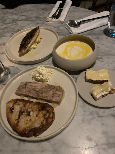 When we arrived, I told the staff I had made a reservation, but they looked at me very confused. The host finally came and seated us. It wasn't busy so it was fine, but my group still felt like confused why they acted the way they did. Anyways, this place has a beautiful view of the skyline and bridge so it was very lovely. We ordered the chicken terrine, cauliflower soup, and mackerel, risotto and sea bream, and the rice pudding and orange sorbet. For the wine, we were just given the option of red or white. The food was amazing. We were super impressed and happy that we were able to do such a meal without hurting our wallets.