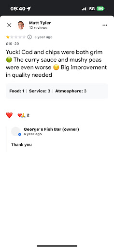 Ā Ā Ā Read moreNormally it's the go to place for us for a takeaway but after what we got last night I need to seriously consider my options. The food was late and once we sorted out what was what there was 5 of us it was cold and soggy not what you expect when you spend the amount of money we did. The taste of the dishes wasnt the same as buying it fresh the fish didnt taste right the chips were rock hard. The chicken which normally what I get what cold and the batter was falling off. My partner got scampi and chips and the kids got fish and chips and my friend got meat and chips and everyone of them had the same issues then we spent the night running in and out of the toilet this trend continued til the early hours. This has never happened before with George's so I was very surprised but not sure if I'm gonna use it again I phoned up to speak to someone and was told to deal with it. It's a shame because it's such a good fish shop and my boys love it but after last nights episode I'm not...