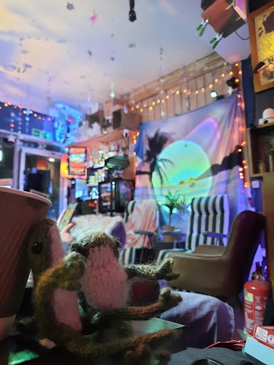 This place fulfills all of those desires, plus a few more (as a photographer, I am OBSESSED with the aesthetics of this place). The entire place has a fantastic techno-ethereal vibe. There are two floors to explore, with the top floor boasting a collection of books, sitting spaces, and free coffee/tea/biscuits. It's a fantastic place to chat with new people – the owner and everyone who comes to stay throughout the night are incredibly open to conversation (but will also equally respect if you'd rather be left alone to write a paper). I had chats about everything from AI risk to my favorite music to angry cats :) speaking of cats, if you're lucky, the owner's cat will come over to say hi, and he is a delight.