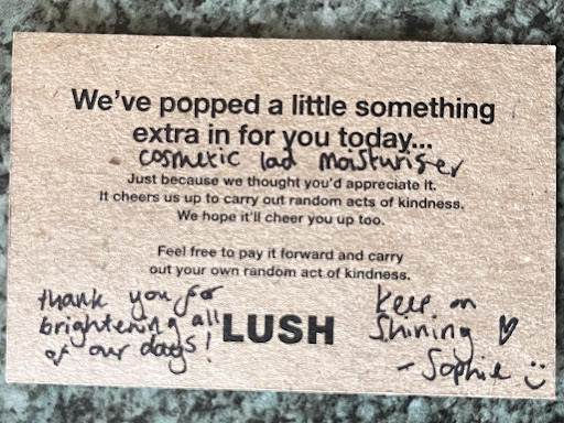 Feeling positively overwhelmed by the warmth we received, we felt compelled to share our gratitude directly with the store manager, Sophie. She welcomed our feedback with such heartfelt emotion, it was clear that the ethos of care and kindness at Lush is led from the top. Upon hearing our praise for her team, she too gifted us her RAK, photo enclosed.